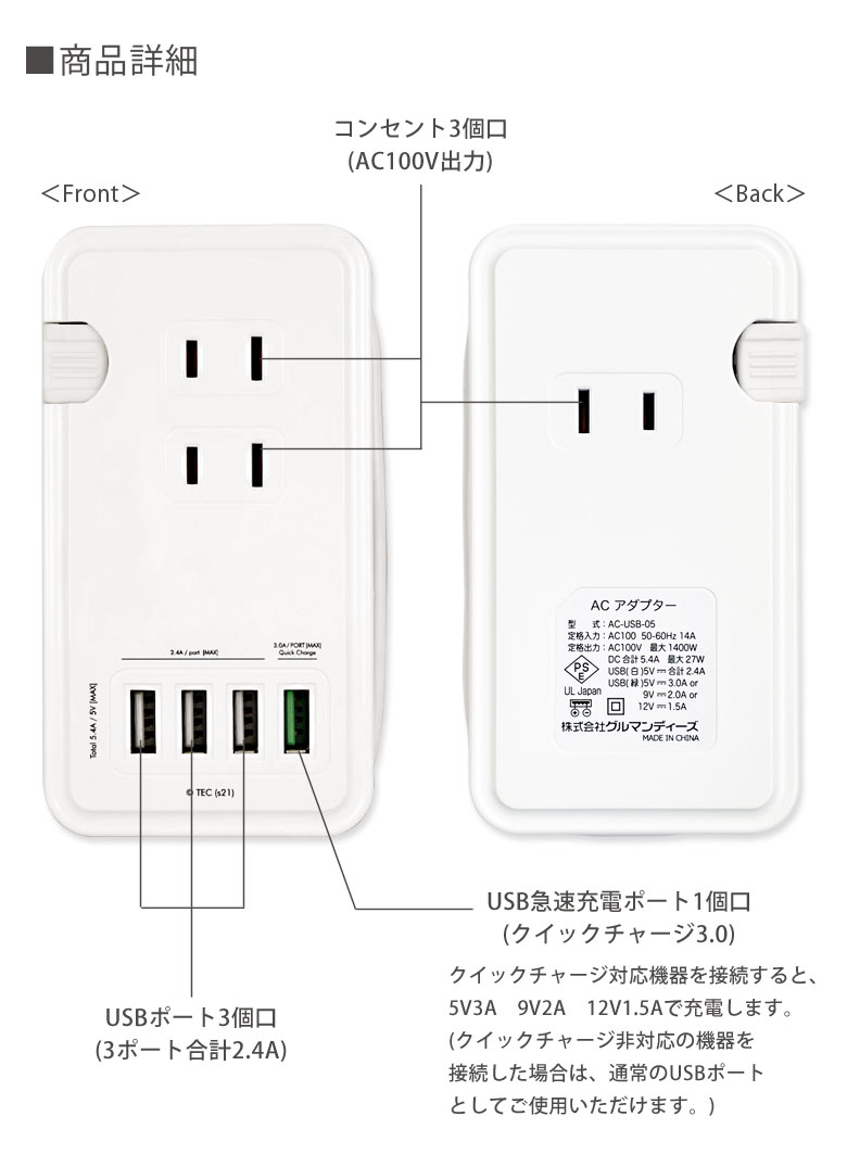 | 仕様 | ・コンセント個口数…3個口(AC100V出力) ・USBポート数…4ポート(合計2.1Aポート×1、クイックチャージ3.0対応ポート×1)