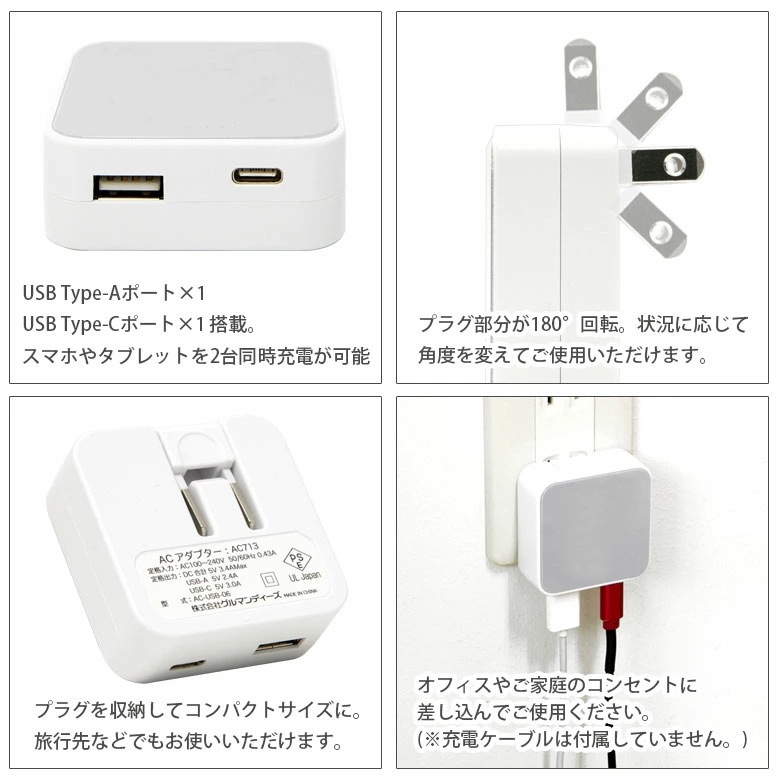 USB AポートとCポートで2台同時充電OK!