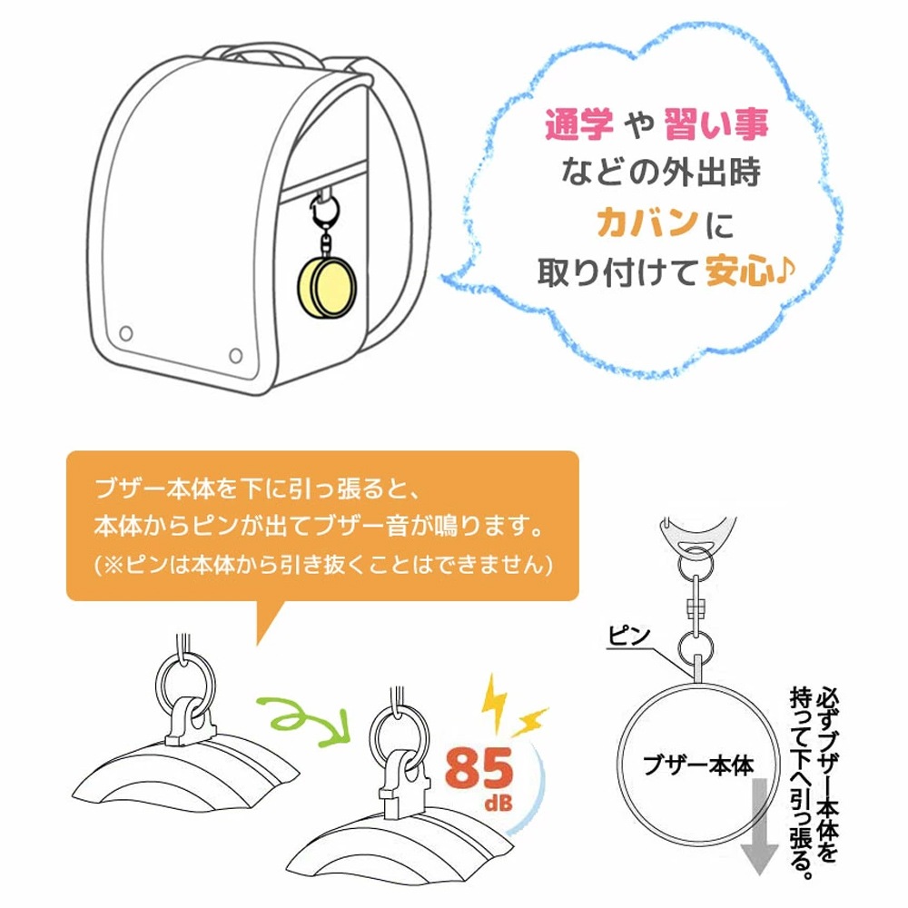 使い方:ご使用の際は、ブザー裏側の絶縁テープを取り除いた後、ブザー本体を引っ張ると大きな音が鳴ります。
